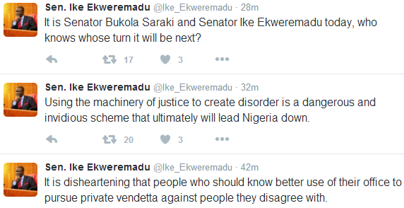 Ike Ekweremadu and Senate President, Bukola Saraki, were arraigned at an Abuja High Court yesterday June 27th, over alleged forgery of the senate order that brought them into office in June last year.