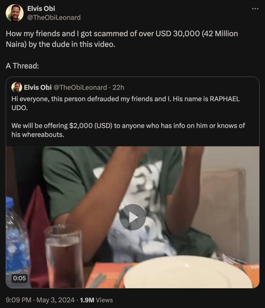 In an initial tweet, “Hi everyone, this person defrauded my friends and I. His name is RAPHAEL UDO. We will be offering $2,000 (USD) to anyone who has info on him or knows of his whereabouts.”