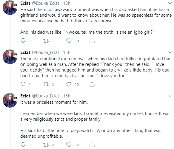 The Twitter user said all the strict man’s kids left the house immediately after they finished NYSC. None wanted to stay a moment longer because of their father’s rules and how he ruled his home with an iron fist.