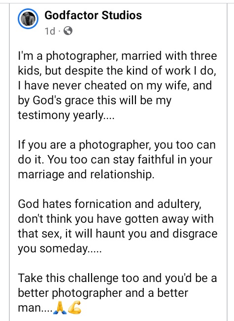 “I’m a photographer, married with three kids, but despite the kind of work I do, I have never cheated on my wife, and by God’s grace this will be my testimony yearly,” he wrote.