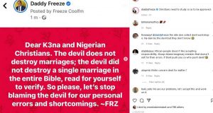 “Dear K3na and Nigerians Christians. The devil does not destroy marriages; the devil did not destroy a single marriage in the entire Bible, read for yourself to verify. So please, stop blaming the devil for our personal errors and shortcoming,” he wrote.
