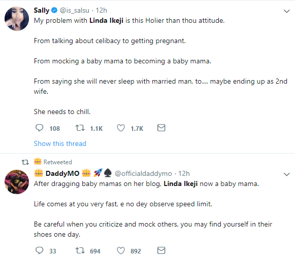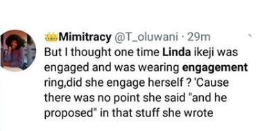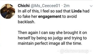 While some Nigerians are asking now is if Linda Ikeji faked her engagement, others are saying she is facing karma as she criticized baby mamas in the past. Here are tweets below;