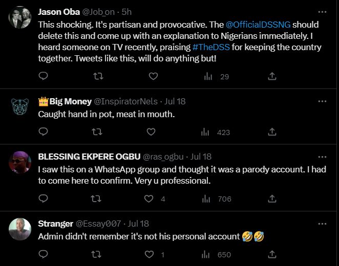 Reacting, the DSS shared series of ethnic-tensed post against the lawyers who are over 60 in number. The bigoted tweets attracted the attention of Nigerians who condemned the secret police over its lack of professionalism.