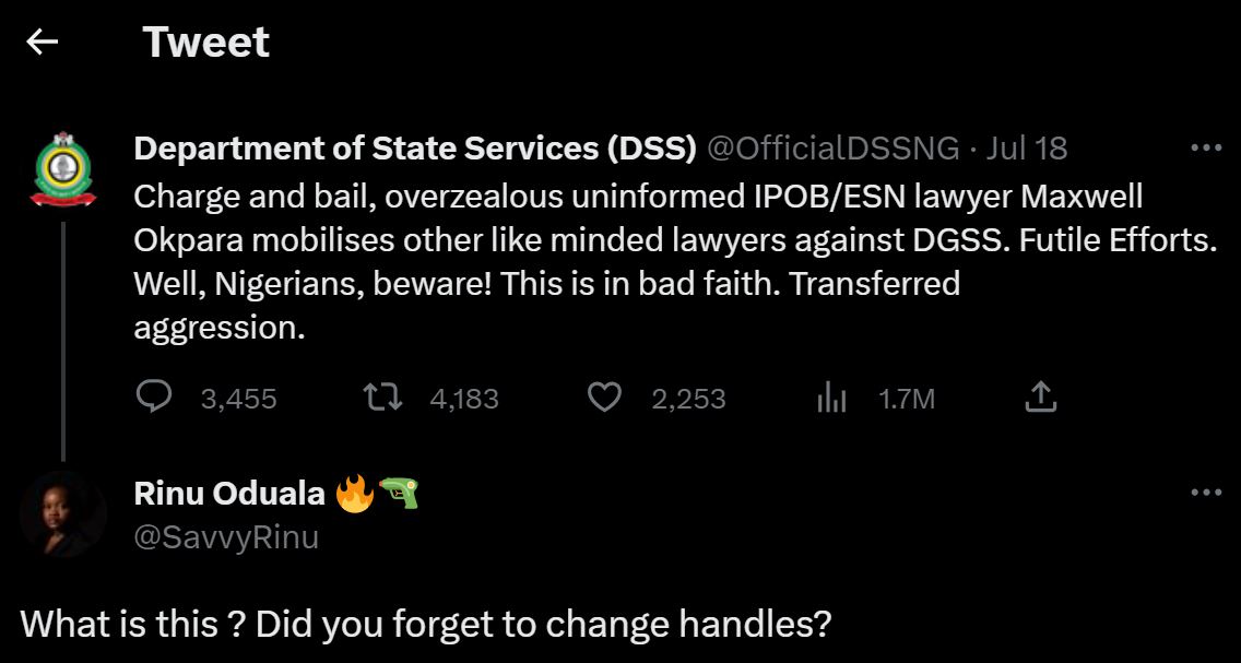 Nigeria’s spy police, the Department of State Security Service has been called out by activist, Rinu Oduala over a controversial post it made against some lawyers who demanded the release of suspended CBN Governor, Godwin Emefiele.