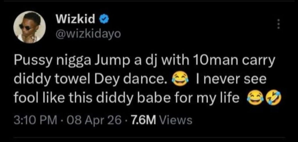 Wizkid went further by reviving his long-running rivalry with Burna Boy, branding him the ultimate “Diddy babe” he had ever encountered. He tweeted: