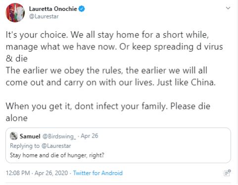 Her answer came after a twitter user ‘Samuel @Birdswing’, had tweeted: “Stay home and die of hunger right?”