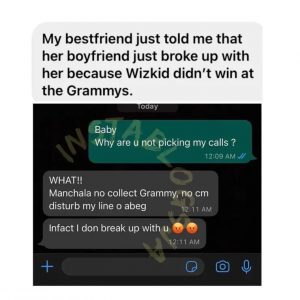 “A die-hard fan of Afrobeat singer Wizkid has ended his relationship with his girlfriend over Wizkid’s failure to win an award at the just concluded Grammy awards.