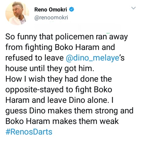 The former aide and PDP popular ranting machine, Reno Omokri reacted to the arrest of controversial senator, Dino Melaye.