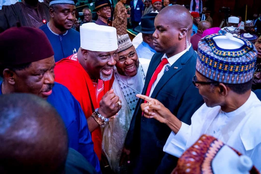 A photograph of senator Dino Melaye greeting President Muhammadu Buhari has gone viral with many people commenting on his ‘humble’ posture. The occasion was Buhari’s 2020 budget presentation to the joint sitting of National Assembly in Abuja on Tuesday. Nigerians on Twitter have reacted since the photo surfaced.
