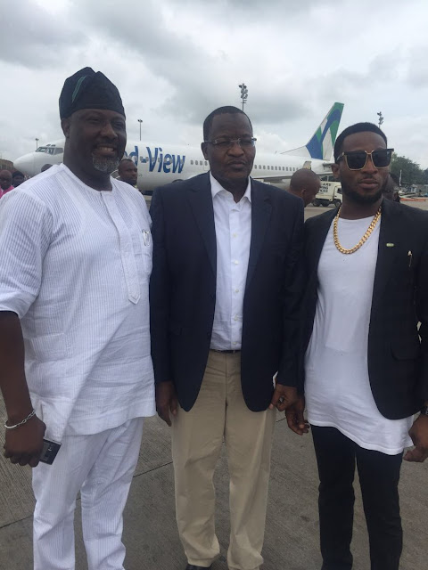 Dino Melaye poses with D’banj on arrival to Lagos