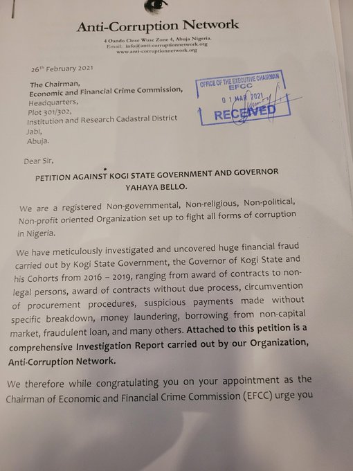 “We have meticulously investigated and uncovered huge financial fraud carried out by Kogi State Government, the Governor of Kogi State and his cohorts from 2016 – 2019,” the letter reads.