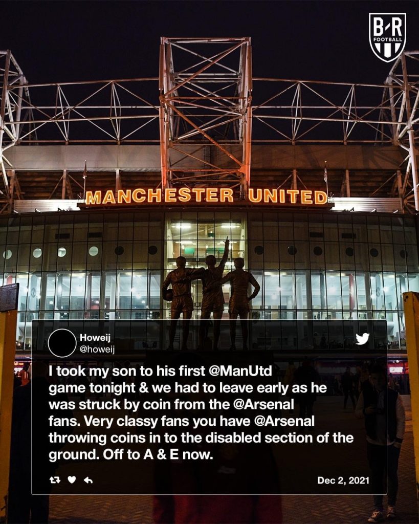 “I took my son to his first @ManUtd game tonight & we had to leave early as he was struck by coin from the @Arsenal fans,” an angry James wrote on Twitter on Thursday.