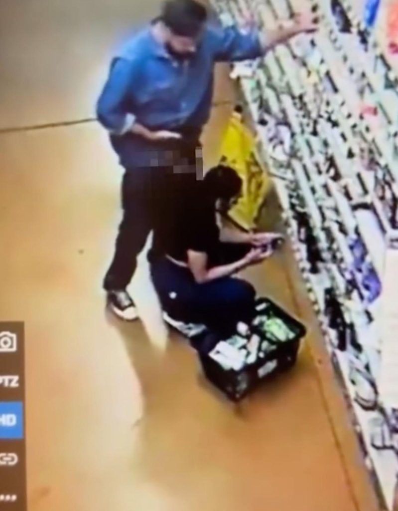 In the footage, the suspect is seen approaching a shopper as she kneels down. He’s seen on the video lowering his pants, then he brings out his genitals and presses it against the woman’s ear while holding what appears to be a cellphone.