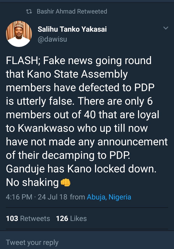 FLASH; Fake news going round that Kano State Assembly members have defected to PDP is utterly false. There are only 6 members out of 40 that are loyal to Kwankwaso who up till now have not made any announcement of their decamping to PDP. Ganduje has Kano locked down. No shaking