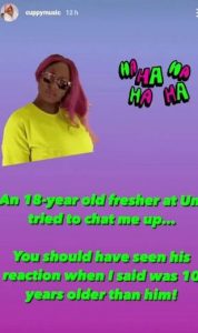Billionaire heiress, Florence Otedola aka Dj Cuppy has disclosed how a fresher — an 18-year old boy tried to chat her up in school.