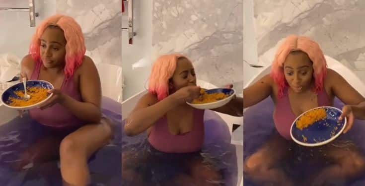 The disc jockey shared a video of herself in the bathroom eating popular Nigerian meal, Jollof rice inside her bathtub.