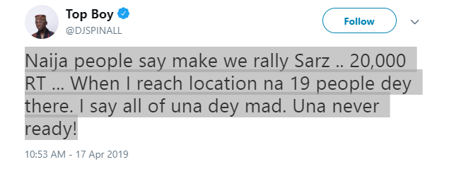 DJ Spinall took to Twitter to call End SARS online activists, who according to him are no quite serious about the campaign against police brutality. DJ Spinall who called out the End SARS online activists, slammed them over a planned rally/protest against police brutality in Lagos. He tweeted;