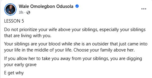 “Do not prioritize your wife above your siblings, especially your siblings that are living with you. Your siblings are your blood while she is an outsider that just came into your life in the middle of your life. Choose your family above her. If you allow her to take you away from your siblings, you are digging your early grave. E get why,” he wrote in a Facebook post on Monday, September 15.