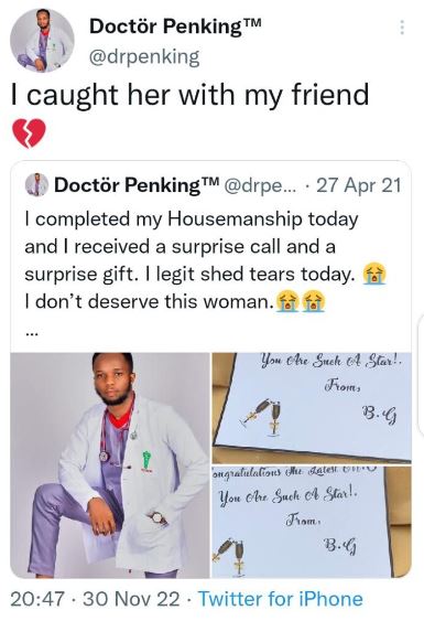 The heartbroken doctor, known as @drpenking on Twitter, said he caught the girlfriend in bed with his friend.