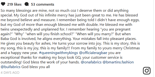 “So many blessings are mine, not so much coz I deserve them or did anything special. My God out of his infinite mercy has just been great to me. He has blessed me beyond believe and measure. I remember being told I didn’t have enough eggs, but my God of more than enough blessed me with double. He blessed me with twins unexpectedly and unplanned for. I remember hearing “you are pregnant again?” “Why” “when will you finish school?” “When will you marry?” But when Baba God is involved, he aligns everything.