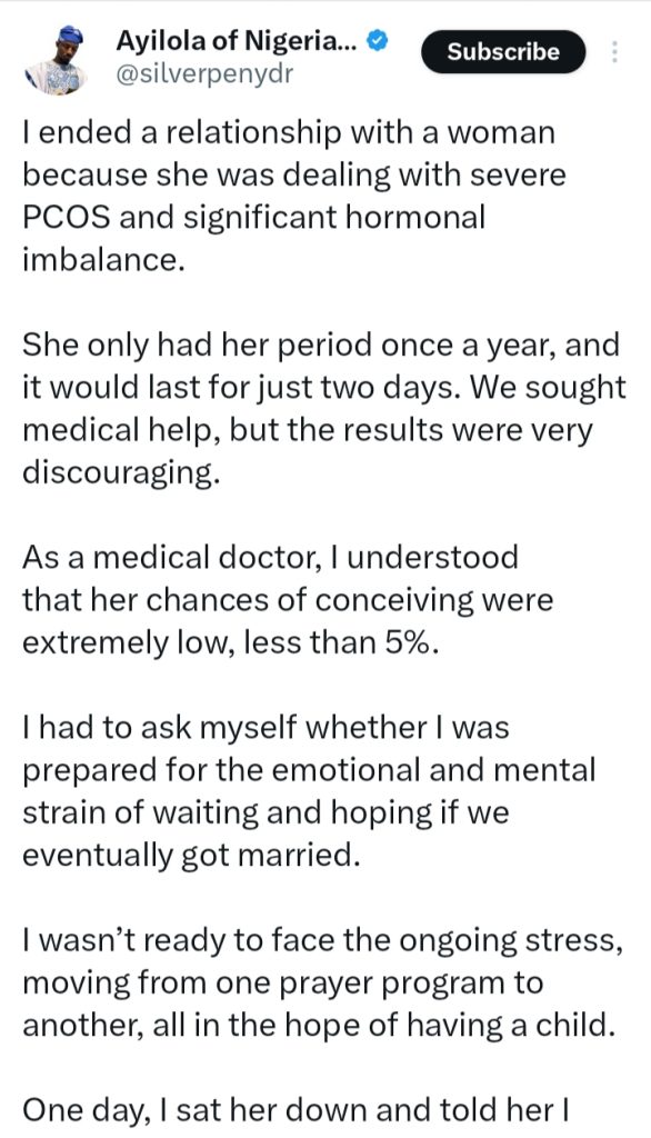 A medical doctor has shared a personal story about ending a relationship due to concerns over fertility linked to Polycystic Ovary Syndrome (PCOS).