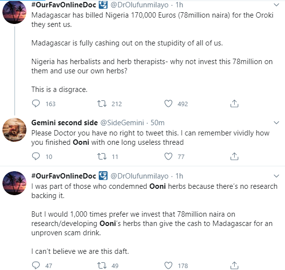 However, after Nigeria imported Madagascar’s herbal cure for COVID-19, Dr Olufunmilayo took to Twitter to say that “Madagascar is cashing out on the stupidity of all of us.” He asked why the FG can’t invest the money spent on Madagascar’s drugs on our own herbalists so that we can come up with herbal drugs of our own.