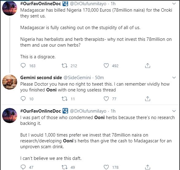 A medical doctor has been called out for contradicting himself after he asked why Nigeria cannot invest the money spent on Madagascar’s drugs on Nigerian herbalists so they can create our own indigenous cure.