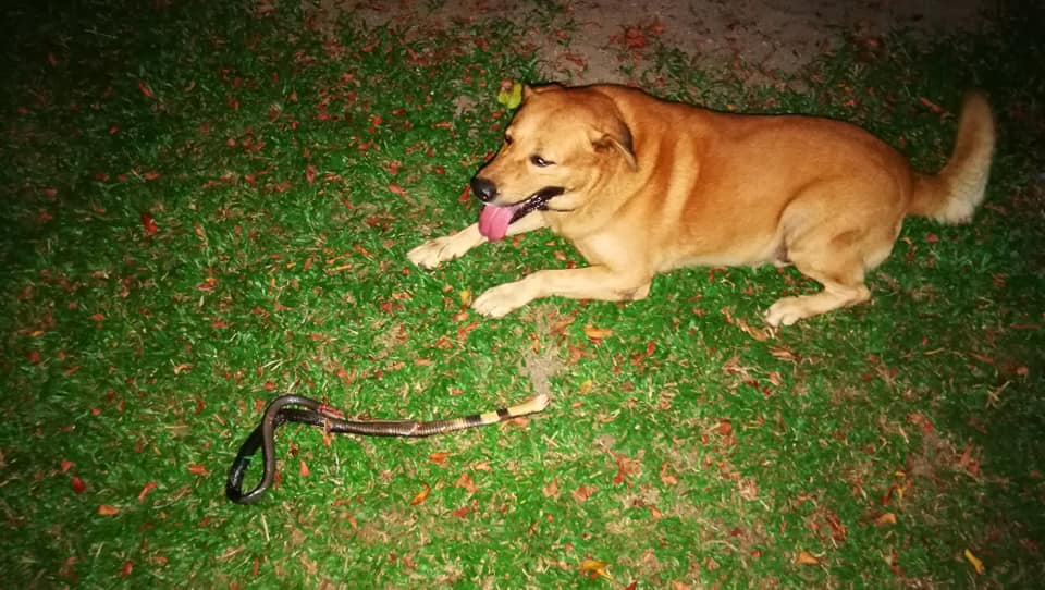 The dog sat by the slain cobra after emerging victorious in the fight.