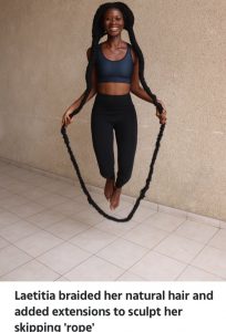 She achieved the record by braiding her natural hair and adding extensions to sculpt her skipping “rope”.