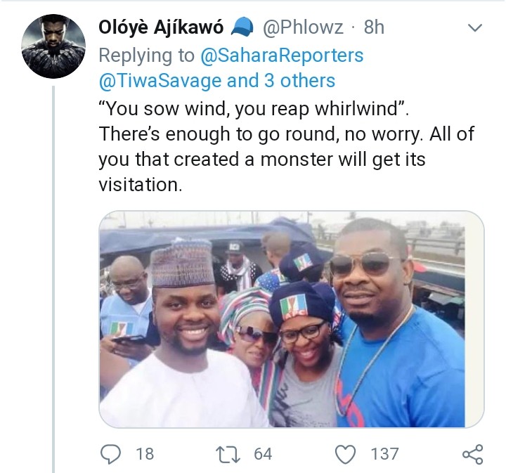 However, a lot of people feel Don Jazzy is actually reaping what he and others sow because they jointly campaigned for Buhari and the APC in 2015.