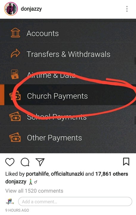 Mavin record boss and producer “donajzzy” who was amazed to see church payment option in his banking mobile app, took to his instagram page to react and share picture of it.