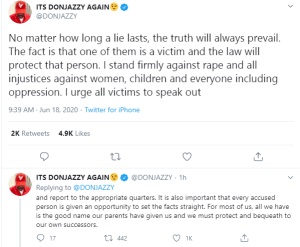 He tweeted; No matter how long a lie lasts, the truth will always prevail. The fact is that one of them is a victim and the law will protect that person.I stand firmly against rape and all injustices against women, children and everyone including oppression.