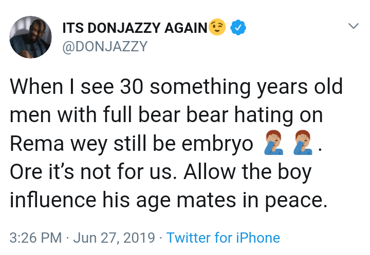 When I see 30 something years old men with full bear bear hating on Rema wey still be embryo. Ore it’s not for us. Allow the boy influence his age mates in peace