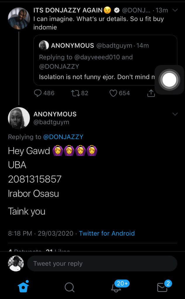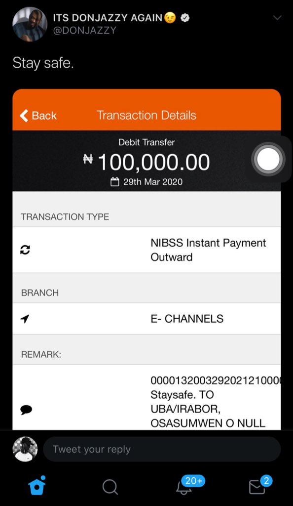 Meanwhile, Don Jazzy did another 100k giveaway after sending money to the guy.