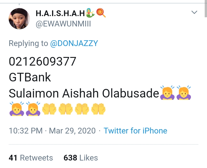 He sent to a lady, @EWAWUNMIII, who said to him: