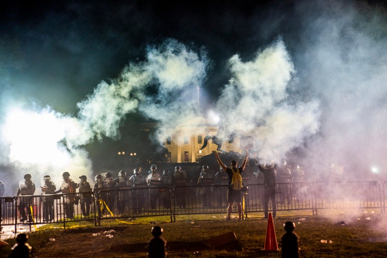 Mr Trump traveled to Florida on Saturday to view the first manned space launch from the US in nearly a decade. He returned to a White House under virtual siege, with protesters – some violent – gathered just a few hundred yards away through much of the night. Demonstrators returned Sunday afternoon, facing off against police at Lafayette Park into the evening.