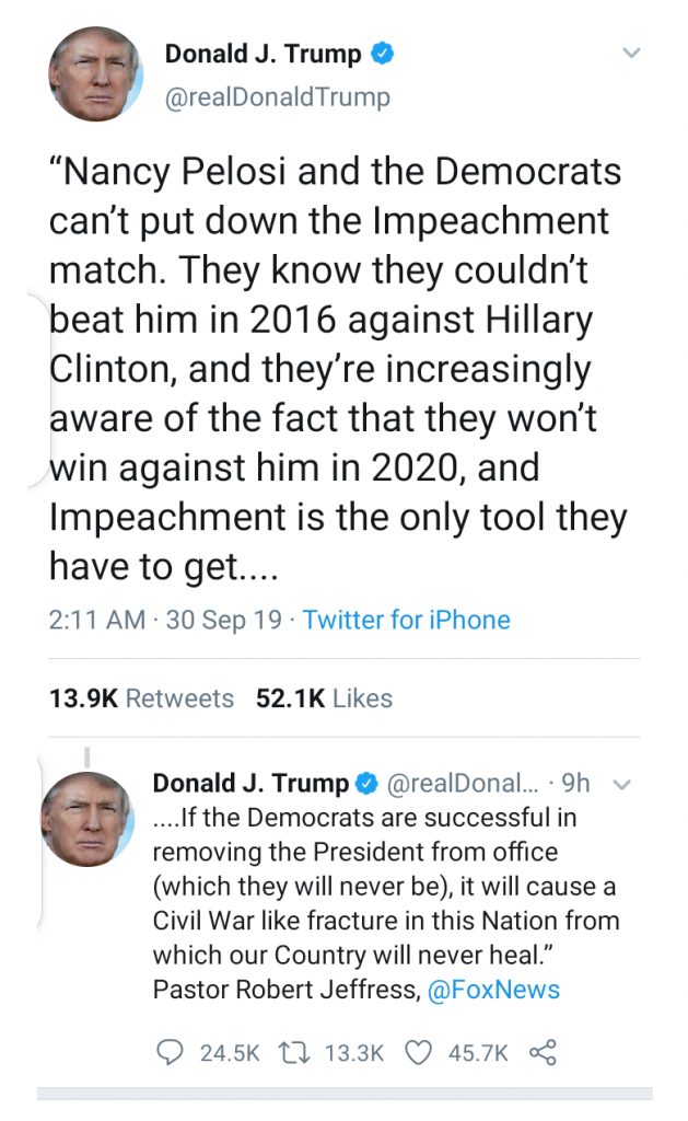 The president approved the quote of Fox News contributor and pastor, Robert Jeffress, in his tweets, claiming the US could enter into a civil war if the House Democrats move ahead with impeachment, as impeachment is a slap on the electorate who put him in power, given that he didn’t commit any grand crimes or misdemeanours.