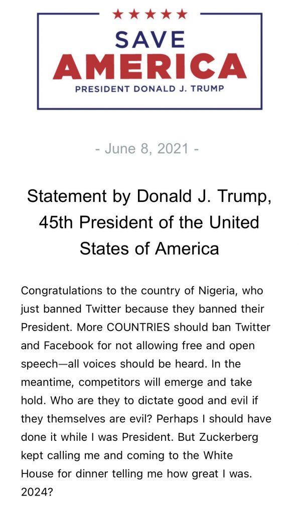 “Congratulations to the country of Nigeria, who just banned Twitter because they banned their President,” Trump said in an emailed statement.