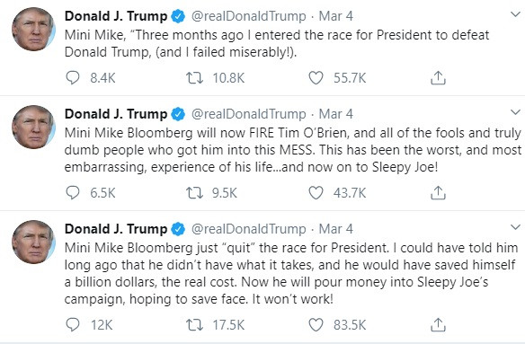 ”Mini Mike Bloomberg just “quit” the race for President. I could have told him long ago that he didn’t have what it takes, and he would have saved himself a billion dollars, the real cost. Now he will pour money into Sleepy Joe’s campaign, hoping to save face. It won’t work!’ Trump continued.