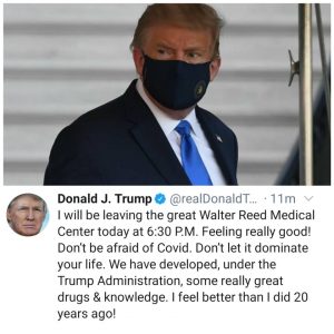 “I will be leaving the great Walter Reed Medical Center today at 6:30 P.M. Feeling really good! Don’t be afraid of Covid. Don’t let it dominate your life.” “We have developed, under the Trump Administration, some really great drugs & knowledge. I feel better than I did 20 years ago!”
