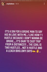 This comes after actress Onyi Alex said it’s a sin for a broke man to say he loves her. The actress had taken to her Instagram Stories to say she doesn’t want to be broke, which is why she works hard.