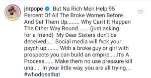 Responding, Junior Pope said many rich men help broke women by setting them up then asked why women can’t do same for men. He went on to say that “with a broke guy or girl with prospects, you can build an empire.“