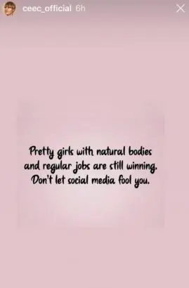 The Reality Star revealed on her Instagram stories, that women with natural body are still winning unlike what social media pressure whats people to believe.