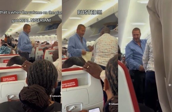 A video showing the moment fellow Nigerians called out a Nigerian man for allegedly stealing a Caucasian man’s bag of money while on a flight, has made the rounds on social media.