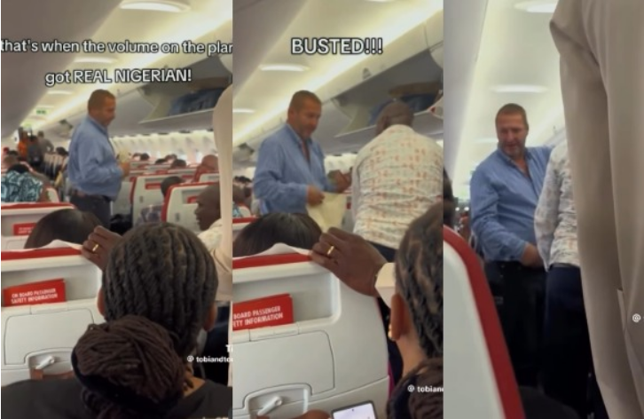A video showing the moment fellow Nigerians called out a Nigerian man for allegedly stealing a Caucasian man’s bag of money while on a flight, has made the rounds on social media.