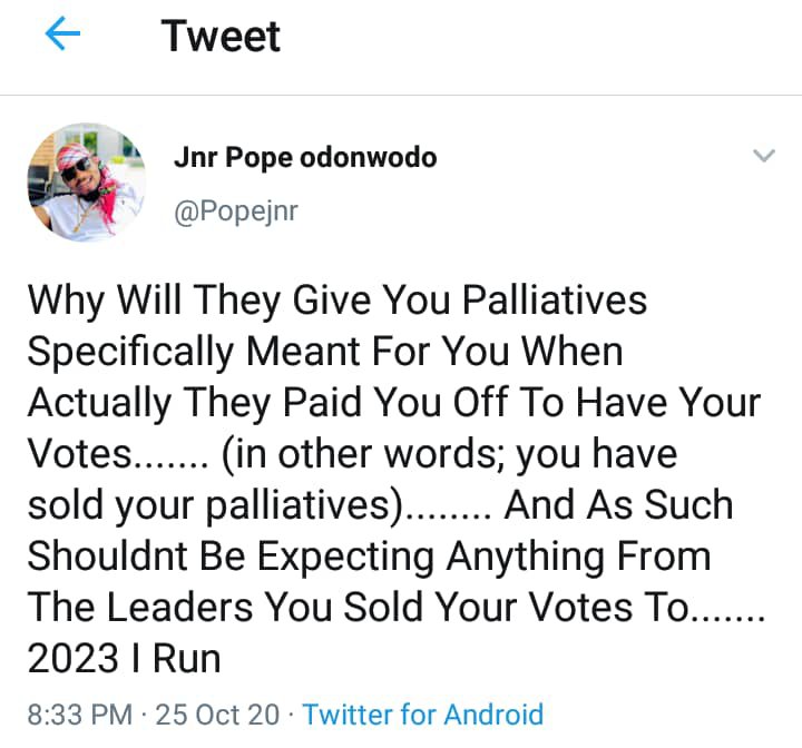 He tweeted “Why Will They Give You Palliatives Specifically Meant For You When Actually They Paid You Off To Have Your Votes……. (in other words; you have sold your palliatives)…….. And As Such Shouldn’t Be Expecting Anything From The Leaders You Sold Your Votes To……. 2023 I Run”