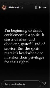 In another post, the comedian said he is starting to believe that the entitlement mentality is a spirit which rears its head when people mistake their priviledges as rights.