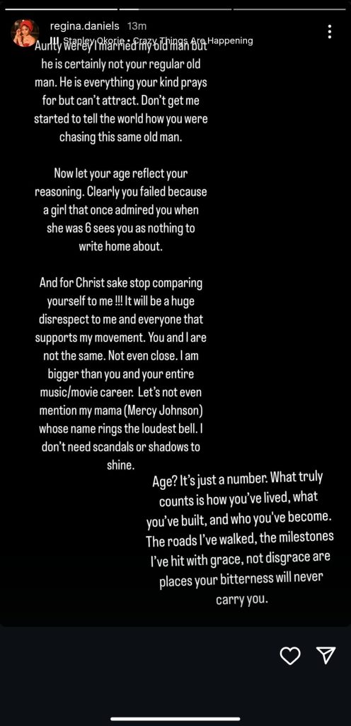 This reply is coming after Angela Okorie’s Instagram outburst, where she warned Regina to stop disrespecting her and accused her of marrying for money.
