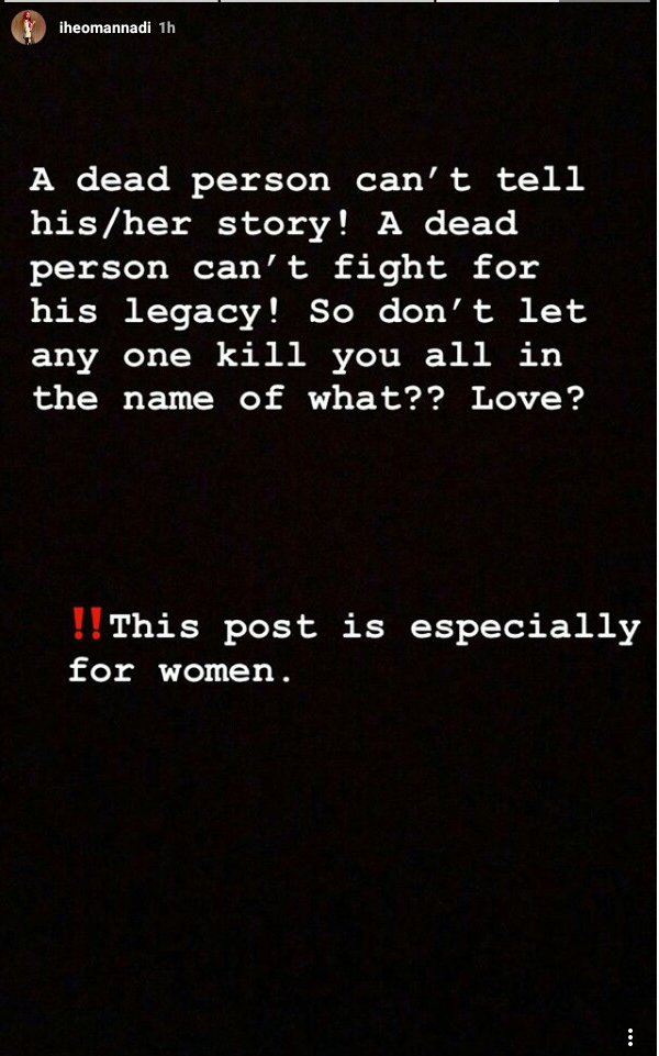 Ex-beauty queen, Iheoma Nnadi has advised women not to let ”anyone kill them all in the name of love.”