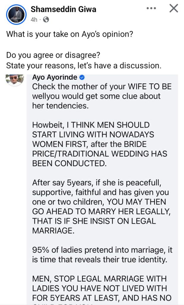 A Nigerian man, Ayo Ayorinde, has advised men not to legally marry women they have not lived and had children with.